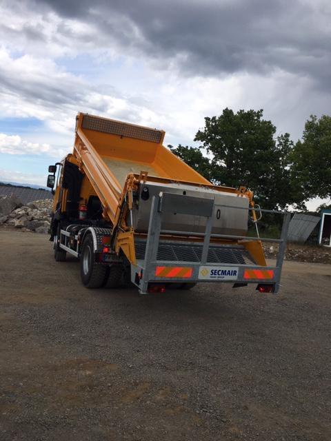Description : 10 T : bi-benne, trappe, remorquant, bâche enrobé, gravillonneur